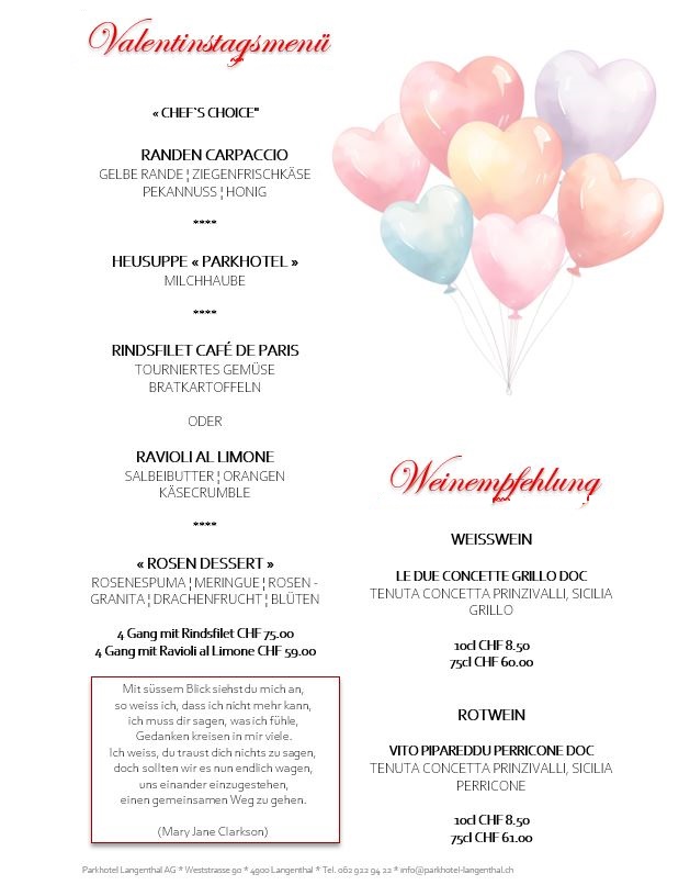 Reserviert einen Tisch unter Tel: 062 922 94 22 oder info@parkhotel-langenthal.ch