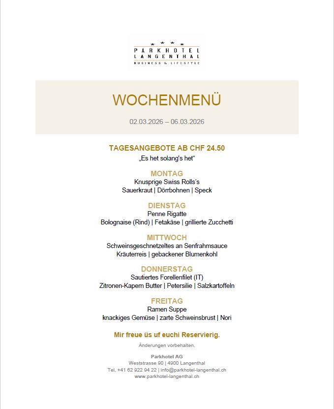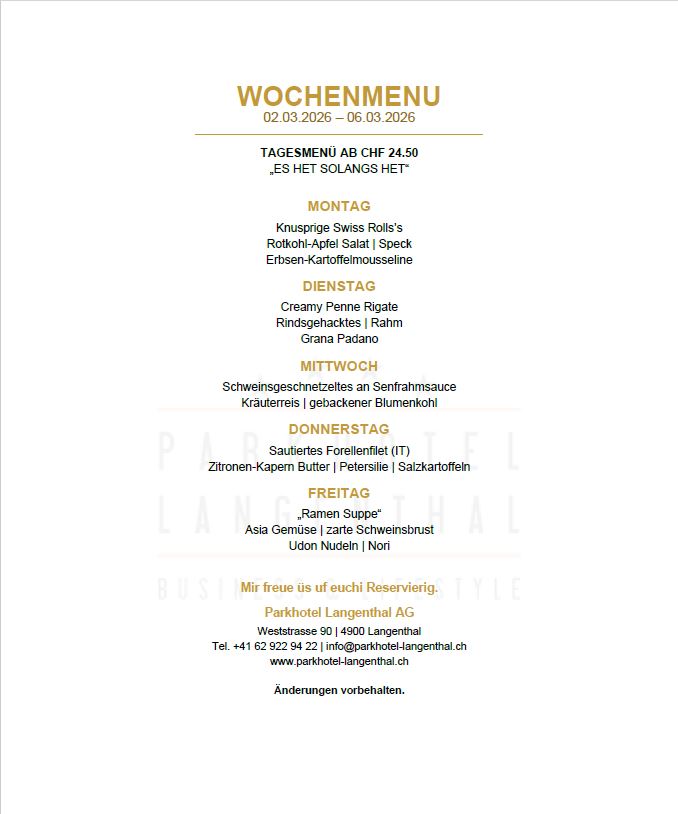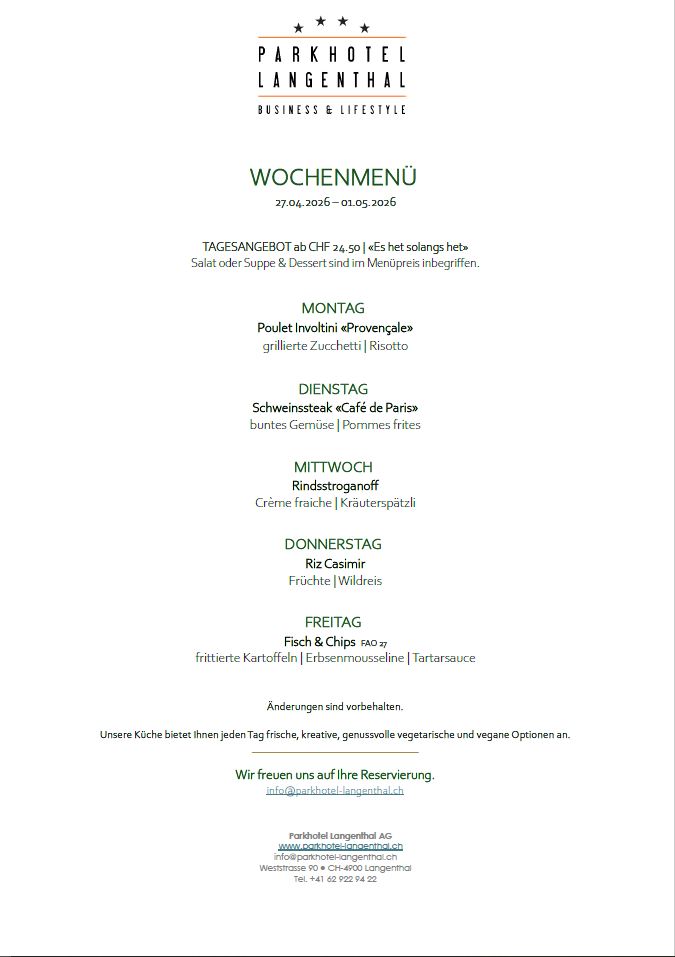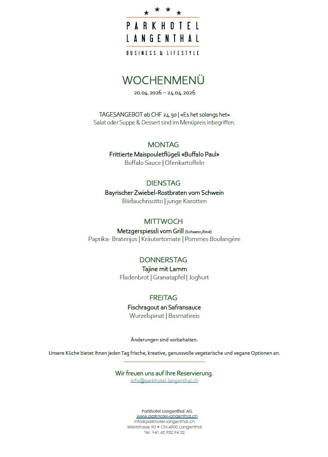 Tel: 062 922 94 22 oder E-Mail: info@parkhotel-langenthal.ch
