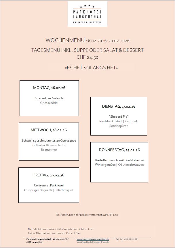 Reserviert einen Tisch unter Tel: 062 922 94 22 oder info@parkhotel-langenthal.ch